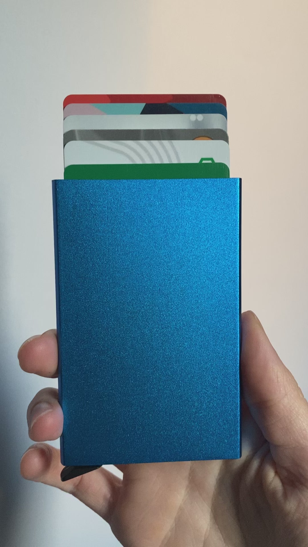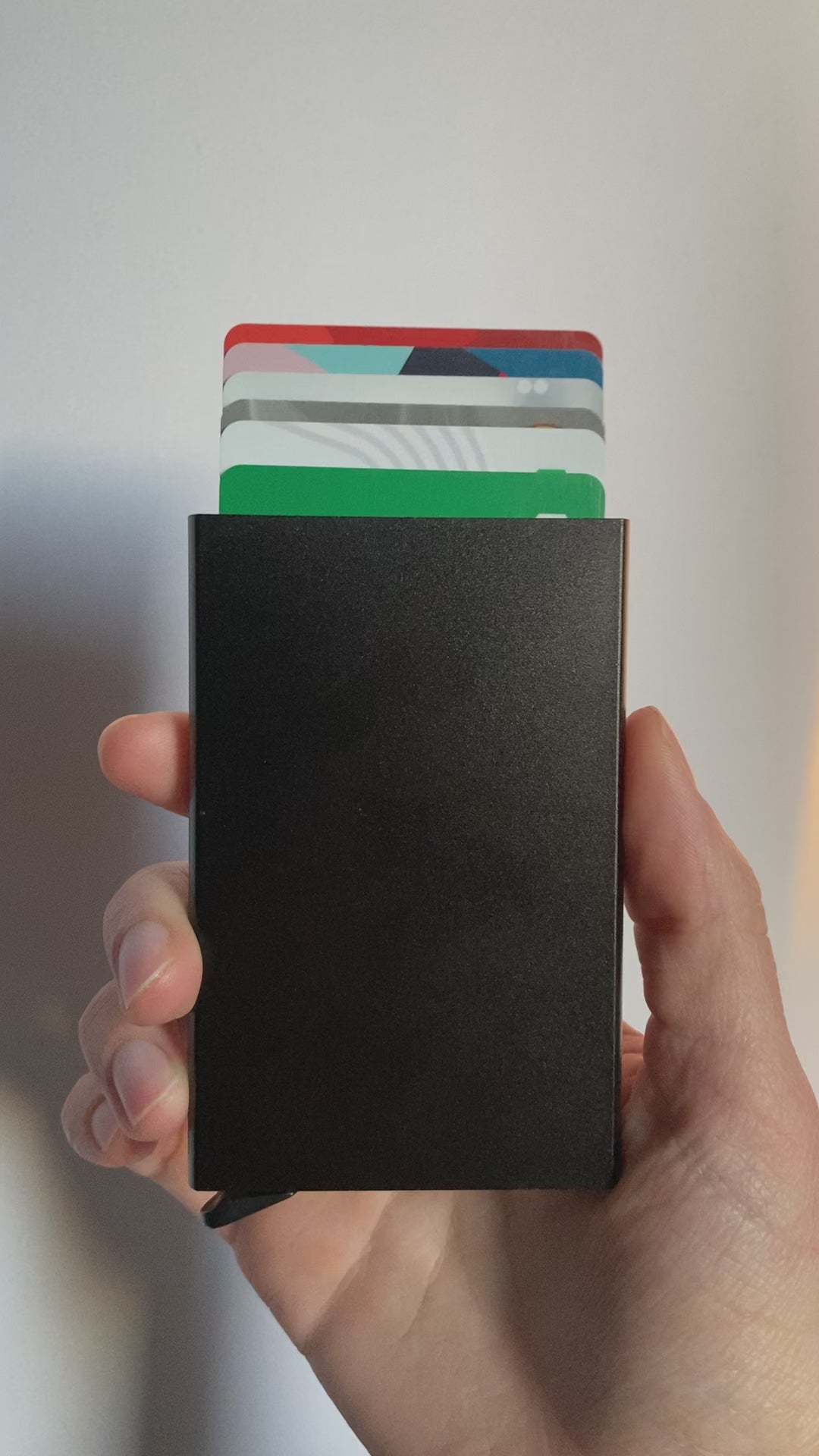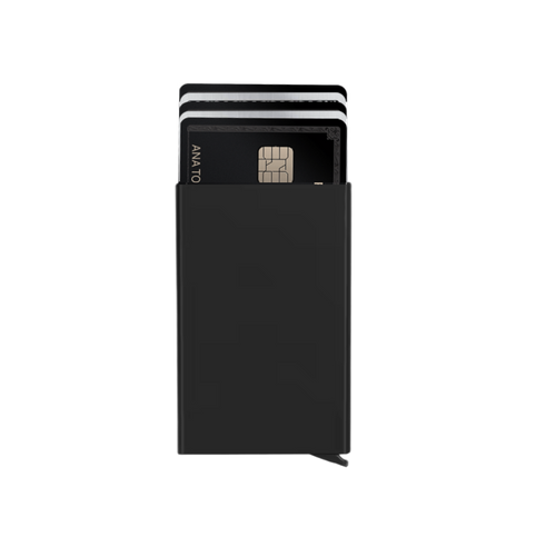 The automatic wallets can hold 1 to 7 cards comfortably. If you only insert one and shake the wallet down really hard, it will not fall. But if you put 2 to 7 cards, and shake down really hard, they will slide down or fall. For regular, normal use (including falls), your cards tightly stay in place - guaranteed and tested 🔒.